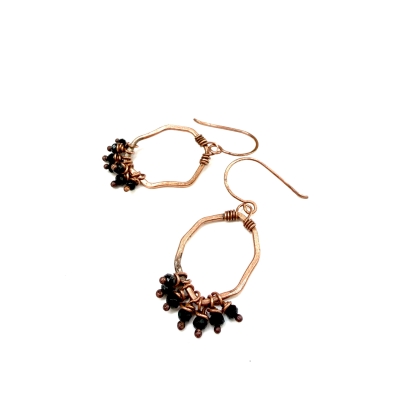 Created out of pure vintage copper wires and a cluster of small faceted glass black beads. Measures 1 and a 1/2 inches long. French wire hooks. The Liver of Sulfur is used to create an antique finish. The earrings are protected with a thin layer of ProtectaClear to prevent tarnishing.