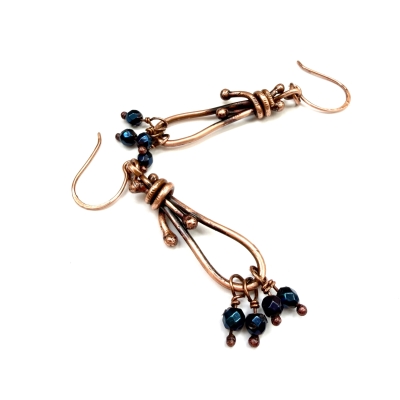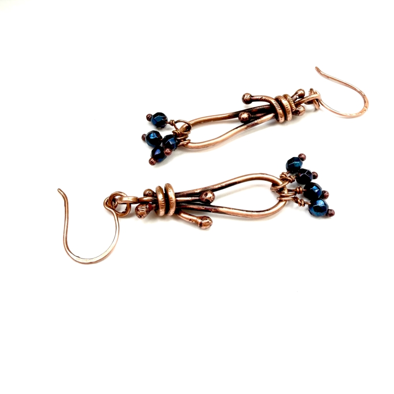 Created out of pure vintage copper wires and a cluster of small faceted blue beads. Measures 2 and a 1/2 inches long. French wire hooks. The Liver of Sulfur is used to create an antique finish. The earrings are protected with a thin layer of ProtectaClear to prevent tarnishing.